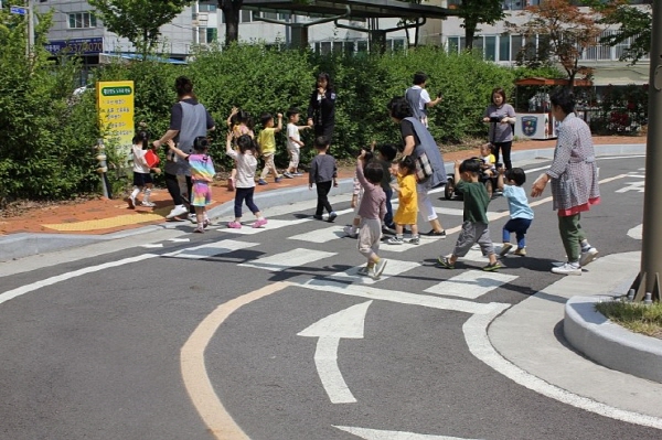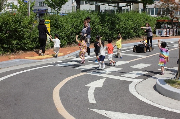 실외교통(횡당보도 건너기, 표지판 보기, 신호등 보기) 항상 좌우를 살피고 뛰지 않으며 안전하게 다니겠다고 약속했다.