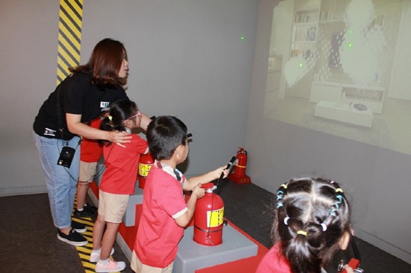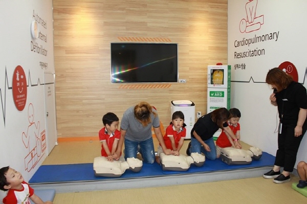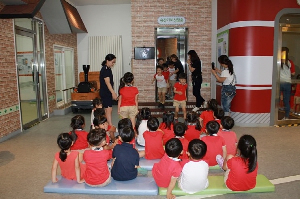 승강기 - 화재 - 심폐 두팀으로 체험존을 돌며 안전교육을 열심히 듣고 배우는 아이들이었다.