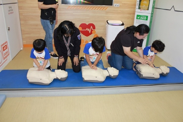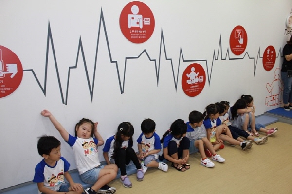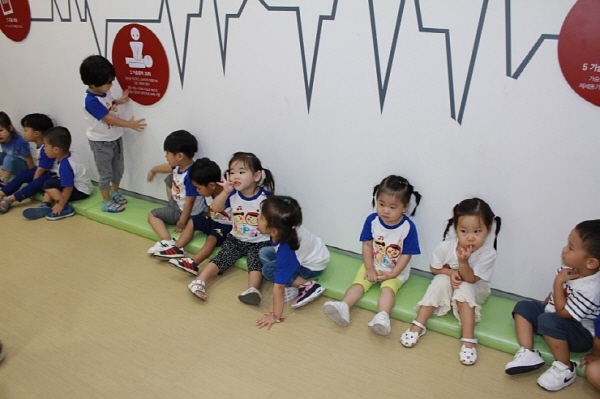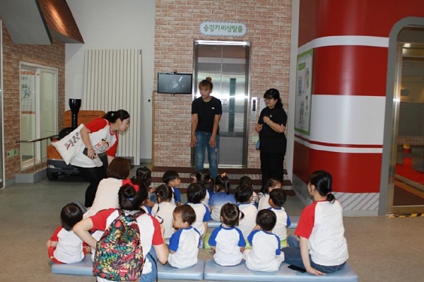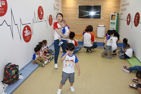 승강기 - 화재 - 심폐 체험존을 돌며 은성어린이집 큰 형아들은 체험교육을 받는데 어린이집 동생들은 낯설고 신기한지 여기저기 구경다니며,