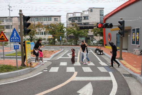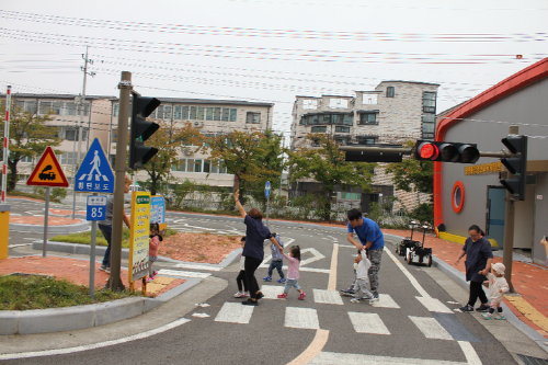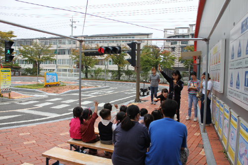 실외교통 표지판, 횡단보도 건너기, 안전벨트 , 자동차 타기 아이들은 씩씩하게 안전교육을 받았다.