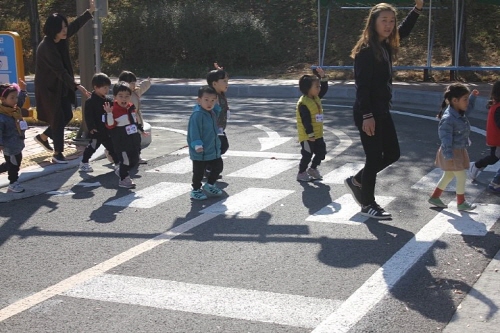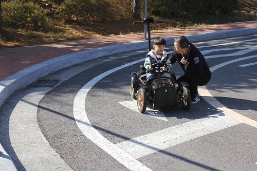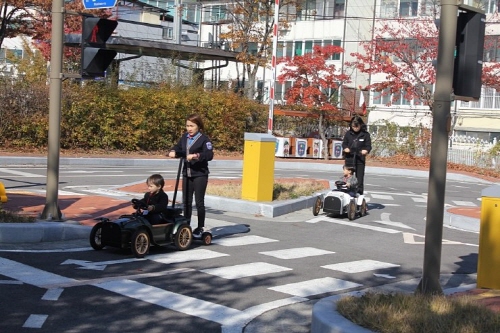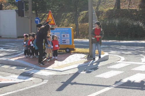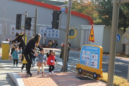 횡단보도 건너기, 표지판 보기, 자동차 타기 안전벨트 착용하기 어린이들이 체험하며 공부하는 진천종합안전교육체험관.